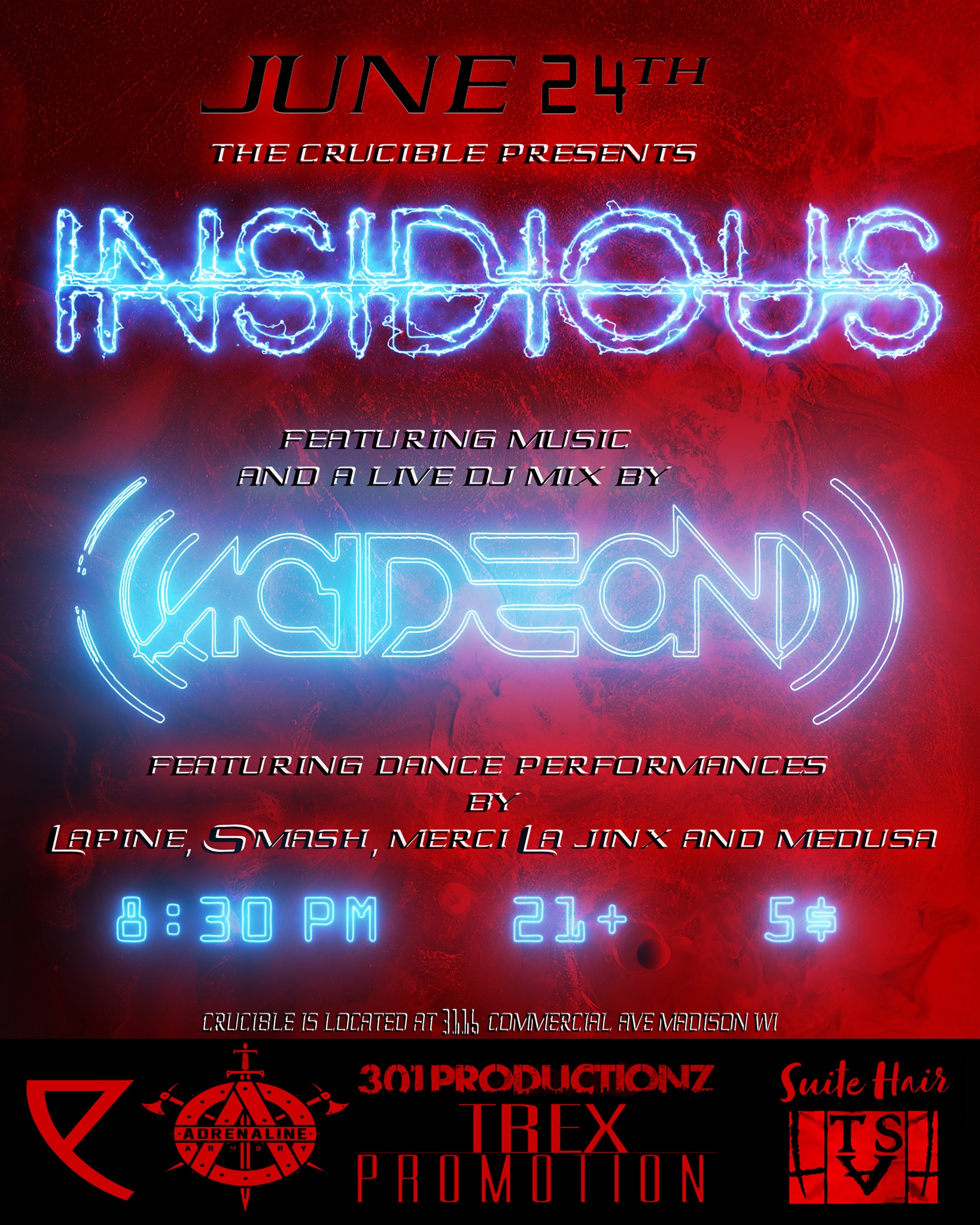Insidious is a night of hard dance, dark psy, goth, industrial and much more brought to you by Crucible Madison and Acideon. Insidious takes place every fourth Thursday of every month at The Crucible.