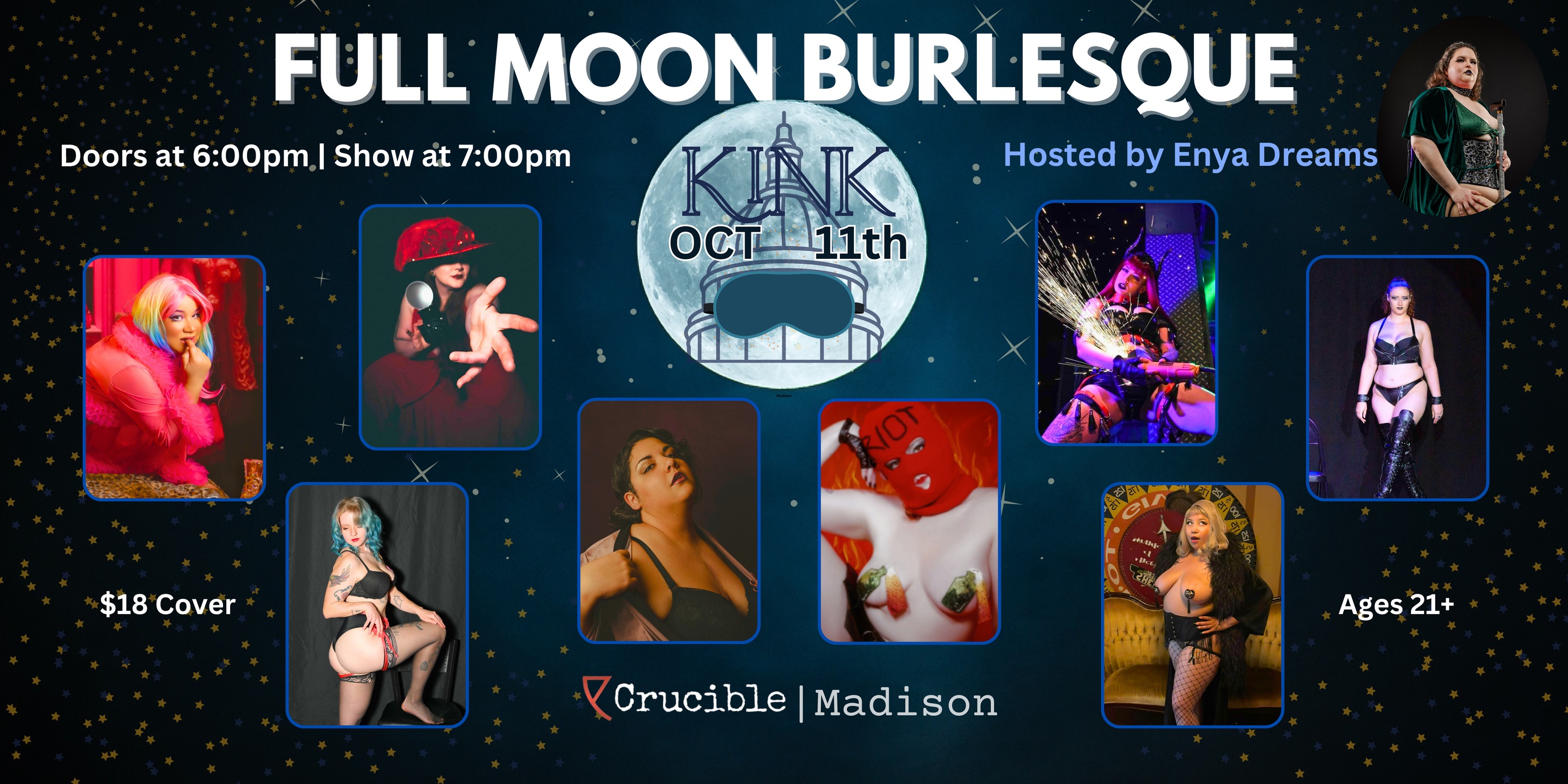 Full Moon Burlesque was created to help the burlesque scene in Madison continue to thrive and grow, inspire our community with touring performers, and utilize Crucible’s stellar stage.