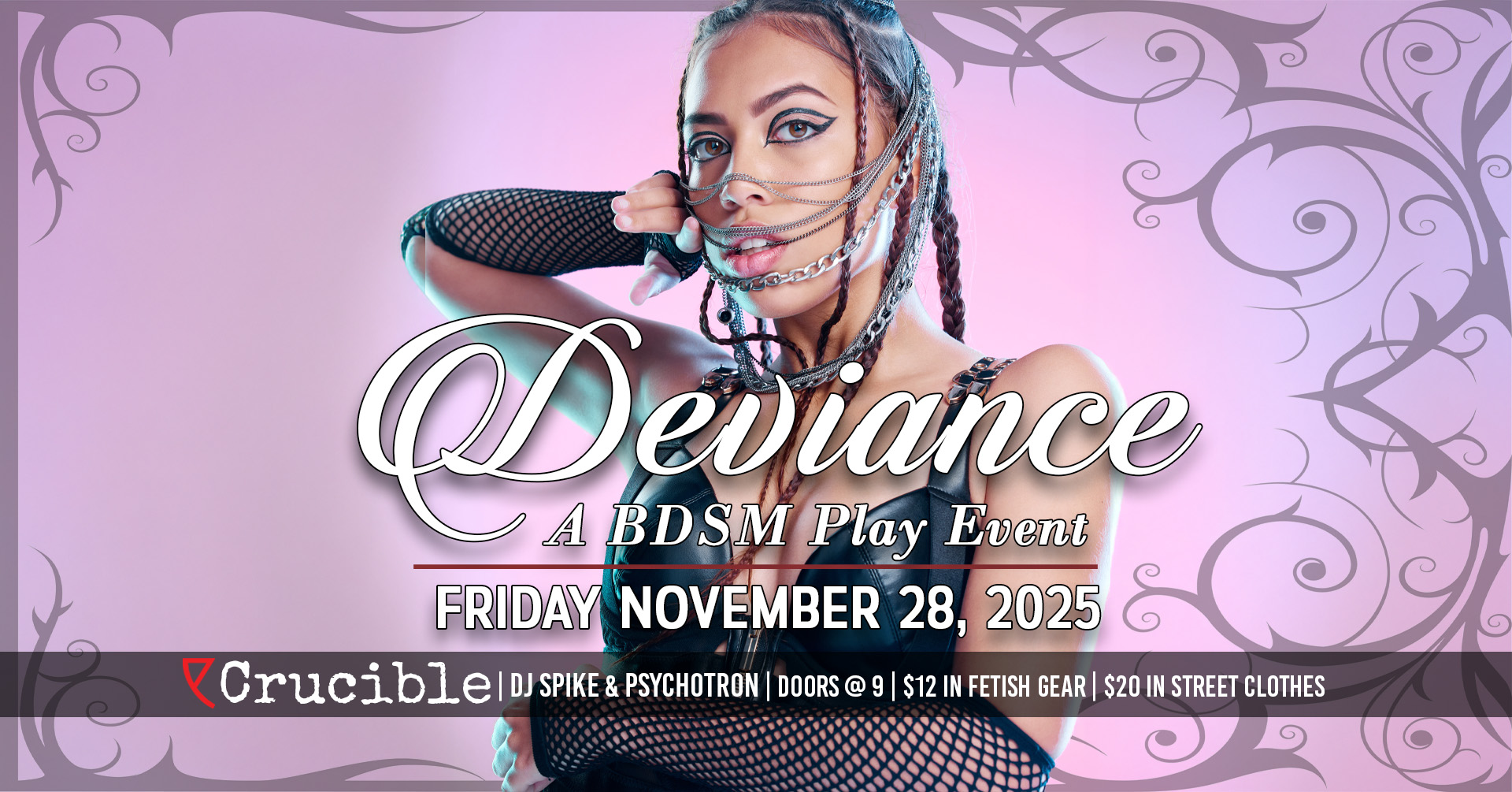 Deviance is a 21+ monthly fetish/BDSM event hosted every 4th Friday at Crucible. Our goal is to provide a welcoming and flexible event for those from all different walks of life, and a space that the patrons can mold into whatever works for them. Do you want to watch and learn a new technique or skill? Does seating for conversation away from the action strike your fancy? Do you want to tie your partner up or put them on a cross and do consensual unspeakables to them? Or maybe just sit back and enjoy the music and take it all in? With a healthy assortment of equipment, plenty of space to play and/or socialize, DJs, and a kick-ass bar no matter what your interest or experience levels are, we have you covered.