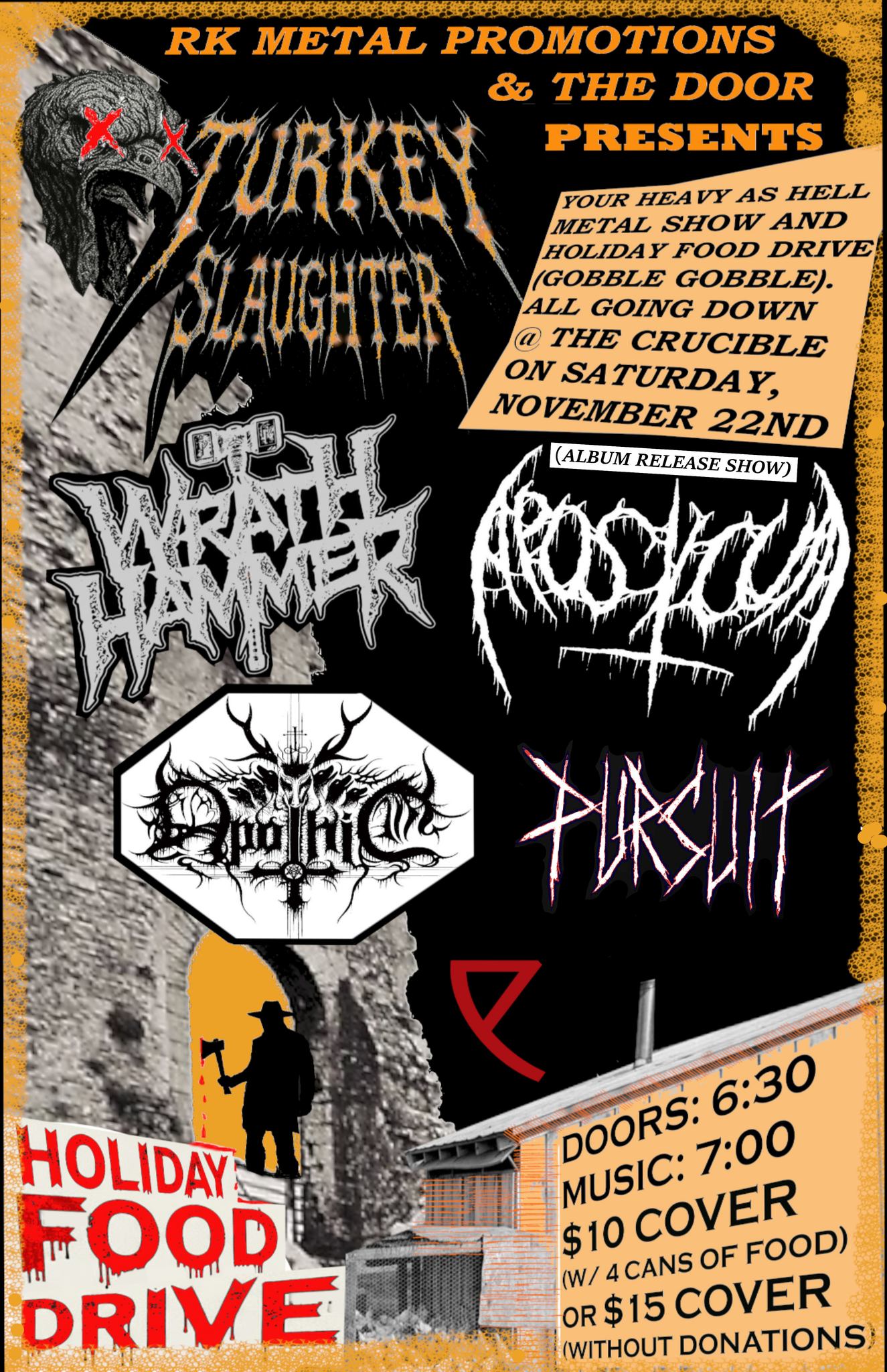 This is a heavy as hell Metal Show the Saturday before Thanksgiving Weekend. We have anywhere from 4 to 6 bands lined up to make your ears Bleed (awaiting confirmations on a few), We are Accepting Canned and non-perishable food for donation to Second Harvest Food before the Holidays. And Free "The Door Gift Certificates" for attendees who donate the most food at the show. More details to come.
