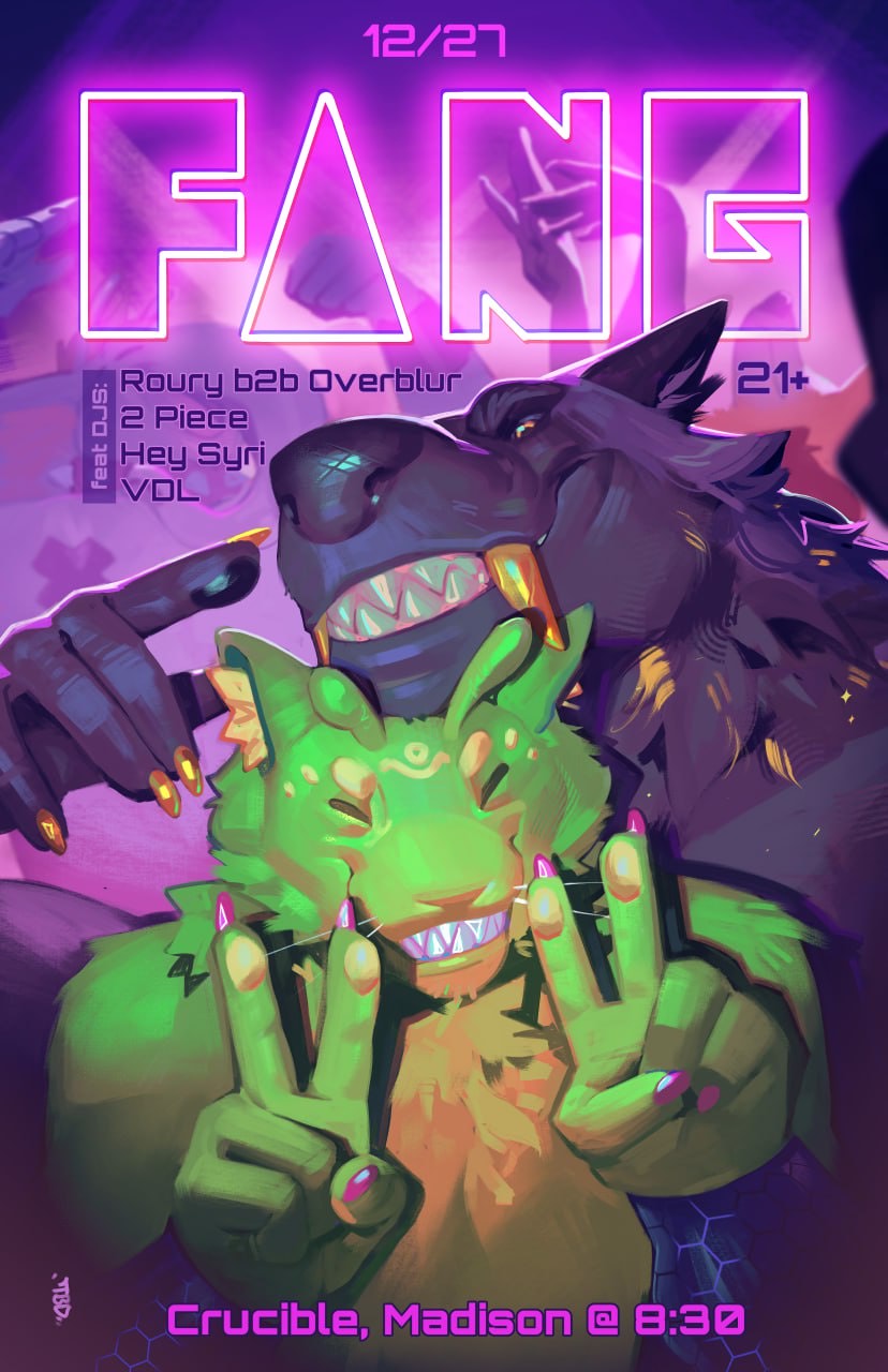 Fang is a space where furries, pups, and people can come together throughout Wisconsin to party like animals. We have furry DJs playing dance music late into the night. It’s a space where all outfits, like fursuits and any type of costume or gear are encouraged but not a necessity to attend. Come to Fang as you are and bring out your inner animal.
