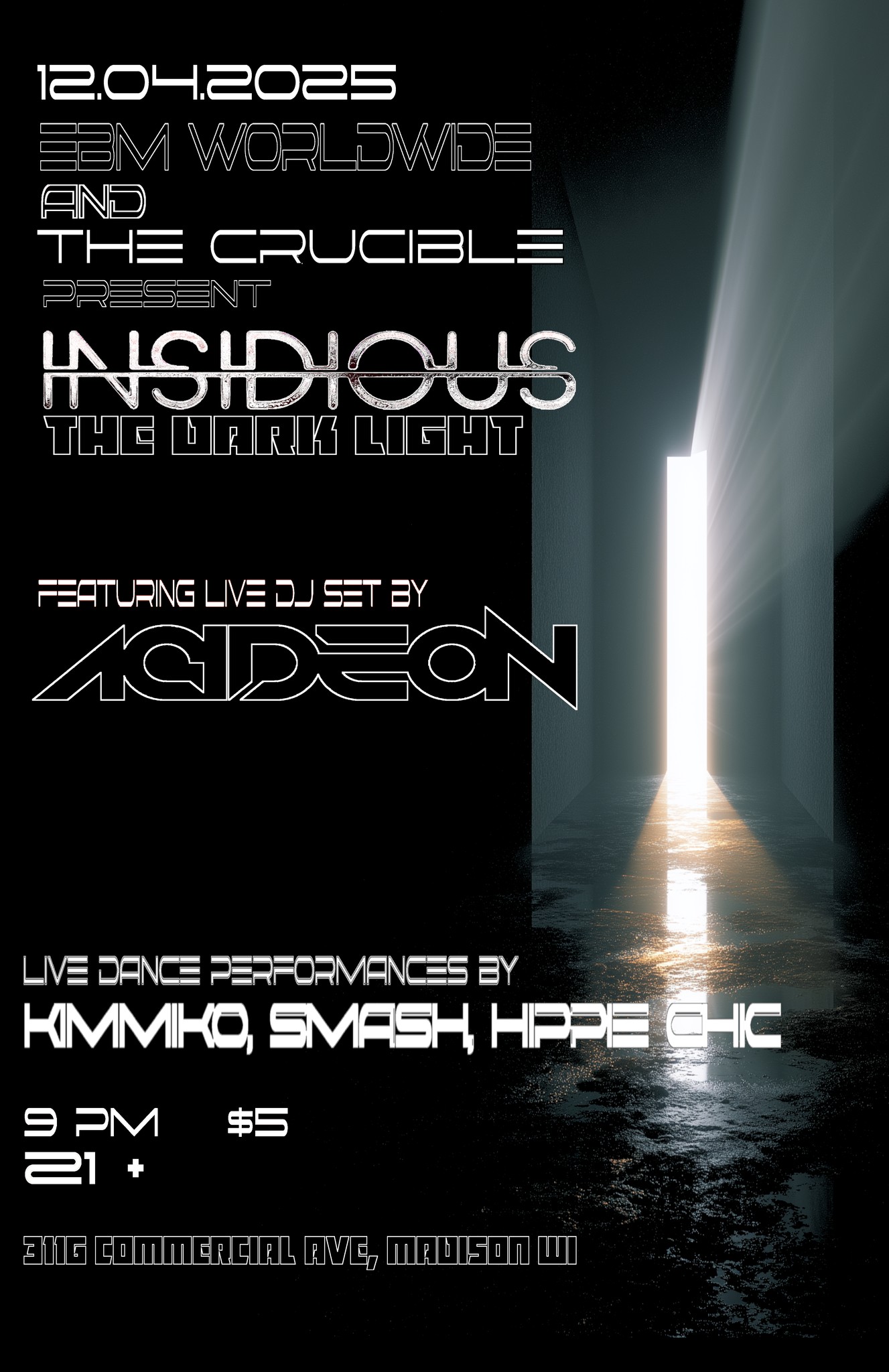 Insidious takes place every fourth Thursday of every month at The Crucible. Featuring live dance performances, custom light show and visuals!
