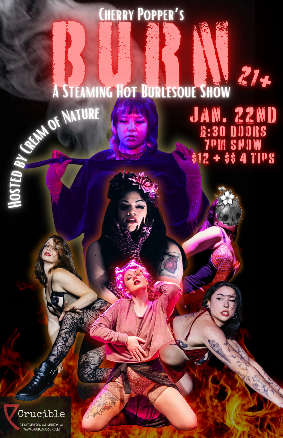 Brrr….it is cold outside! Who is ready to warm up!? The frigid cold only needs some steam to melt, and if your tush is frozen, you may need sultry entertainment to heat that keister. We have the HOTTEST burlesque show coming to the Crucible stage January 22nd. BURN is the perfect way to feel the heat on a cold winter night, with a sizzling cast that is so On Fire you may need to wear oven mitts.