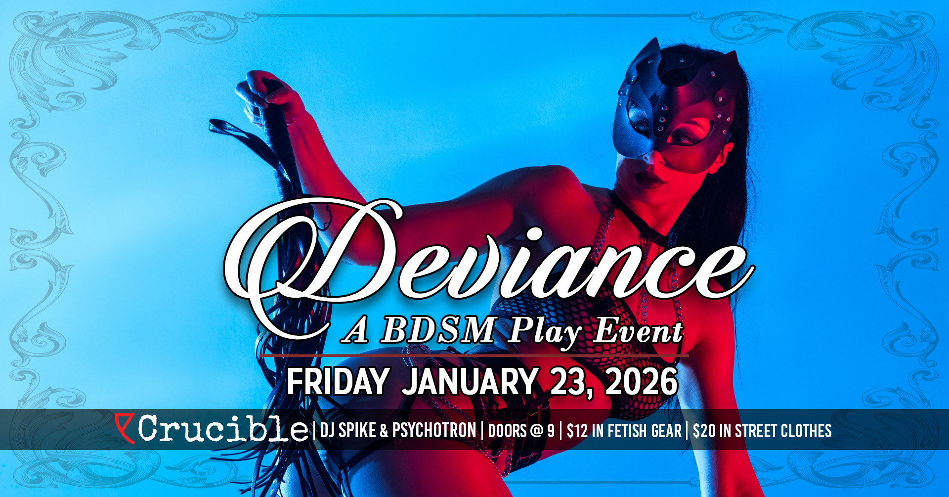 Deviance is a 21+ monthly fetish/BDSM event hosted every 4th Friday at Crucible. Our goal is to provide a welcoming and flexible event for those from all different walks of life, and a space that the patrons can mold into whatever works for them. Do you want to watch and learn a new technique or skill? Does seating for conversation away from the action strike your fancy? Do you want to tie your partner up or put them on a cross and do consensual unspeakables to them? Or maybe just sit back and enjoy the music and take it all in? With a healthy assortment of equipment, plenty of space to play and/or socialize, DJs, and a kick-ass bar no matter what your interest or experience levels are, we have you covered.