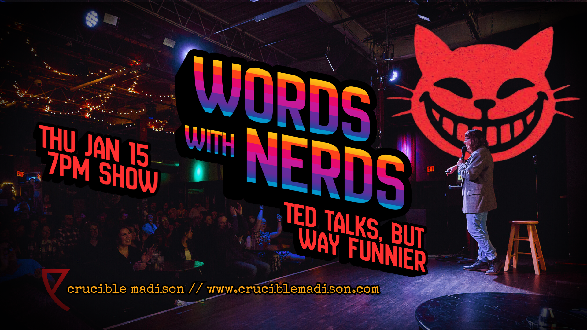 Words with Nerds mixes TED Talks with stand-up by bringing together local specialists and comedians to present on a topic of their choice. Come for the laughs and walk away with strange new knowledge – previous performers have regaled audiences with presentations about dinosaur rib anatomy, a principal component analysis of the Taco Bell Menu, nipple equality activism in Madison, how people misuse statistics, what can be learned from watching 100 Hallmark movies, how to perform self-surgery, and much, much more.