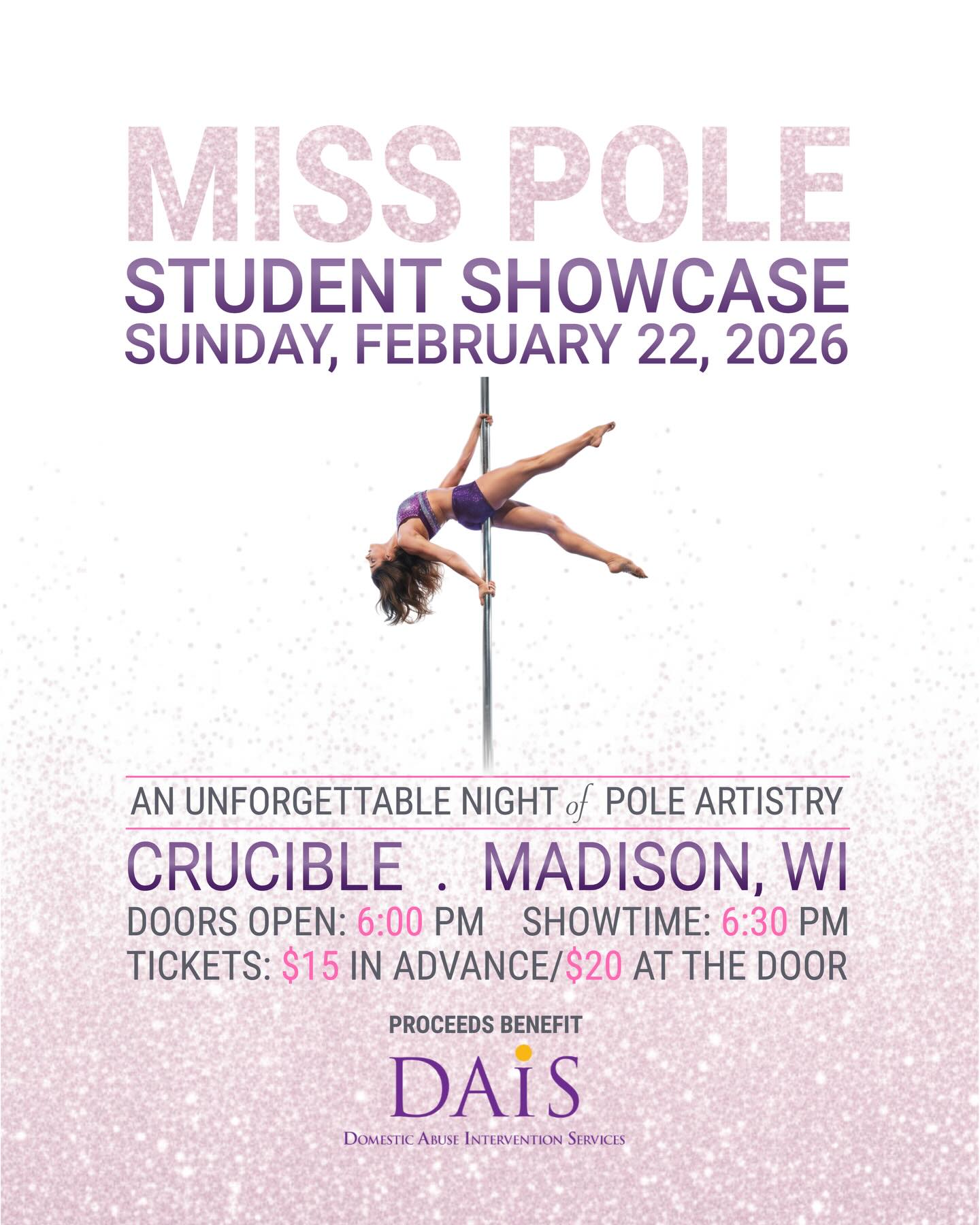Miss Pole Student Showcase is almost here. Join us for a night of pole artistry, big energy, and even bigger heart on Sunday, February 22, at Crucible in Madison. Doors open at 6:00 PM, and showtime is 6:30 PM. Tickets are available at misspole.com/madison
