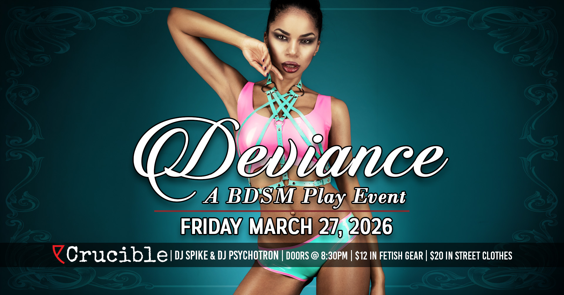 Deviance is a 21+ monthly fetish/BDSM event hosted every 4th Friday at Crucible. Our goal is to provide a welcoming and flexible event for those from all different walks of life, and a space that the patrons can mold into whatever works for them. Do you want to watch and learn a new technique or skill? Does seating for conversation away from the action strike your fancy? Do you want to tie your partner up or put them on a cross and do consensual unspeakables to them? Or maybe just sit back and enjoy the music and take it all in? With a healthy assortment of equipment, plenty of space to play and/or socialize, DJs, and a kick-ass bar no matter what your interest or experience levels are, we have you covered.