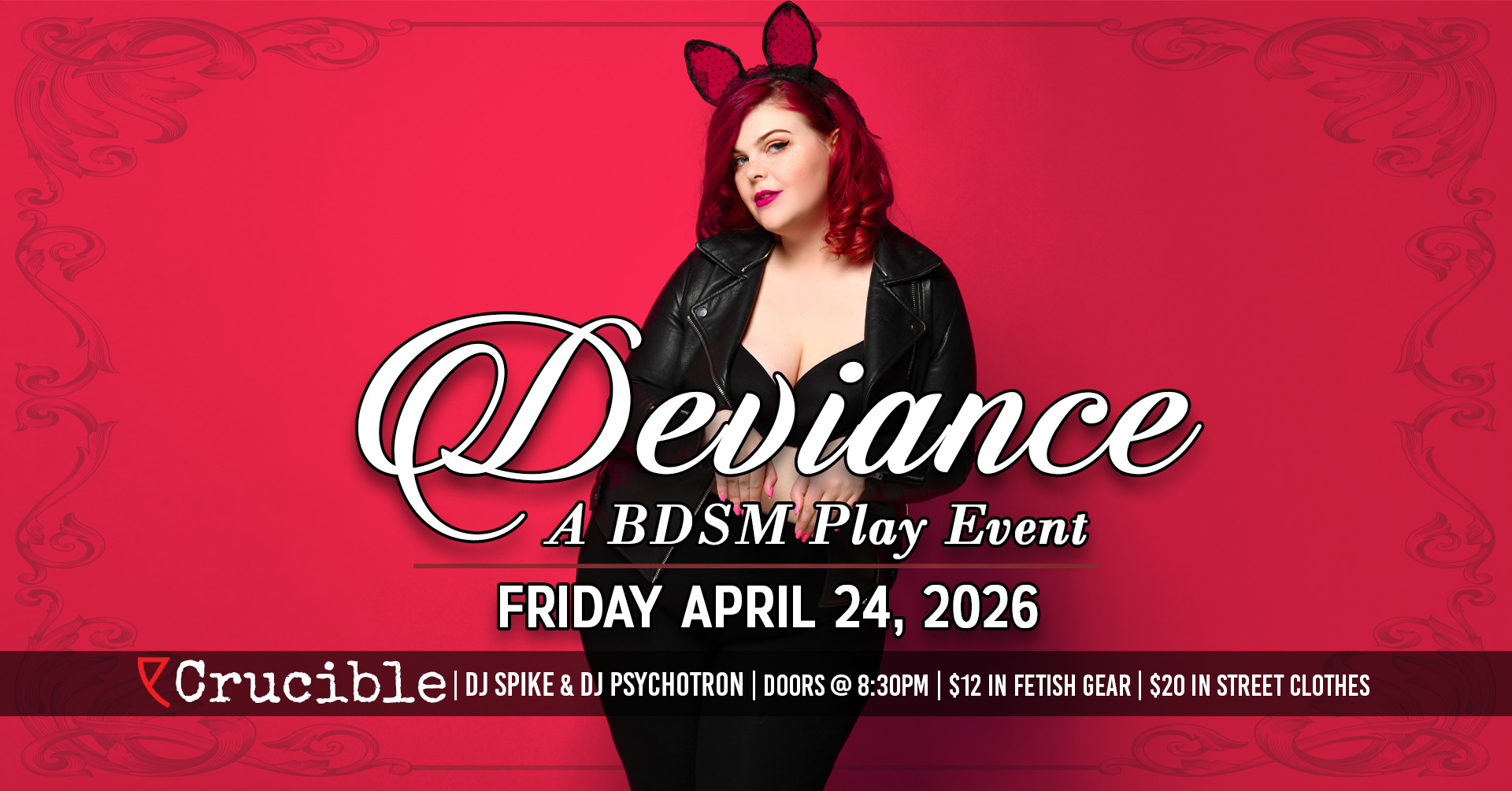 Deviance is a 21+ monthly fetish/BDSM event hosted every 4th Friday at Crucible. Our goal is to provide a welcoming and flexible event for those from all different walks of life, and a space that the patrons can mold into whatever works for them. Do you want to watch and learn a new technique or skill? Does seating for conversation away from the action strike your fancy? Do you want to tie your partner up or put them on a cross and do consensual unspeakables to them? Or maybe just sit back and enjoy the music and take it all in? With a healthy assortment of equipment, plenty of space to play and/or socialize, DJs, and a kick-ass bar no matter what your interest or experience levels are, we have you covered.