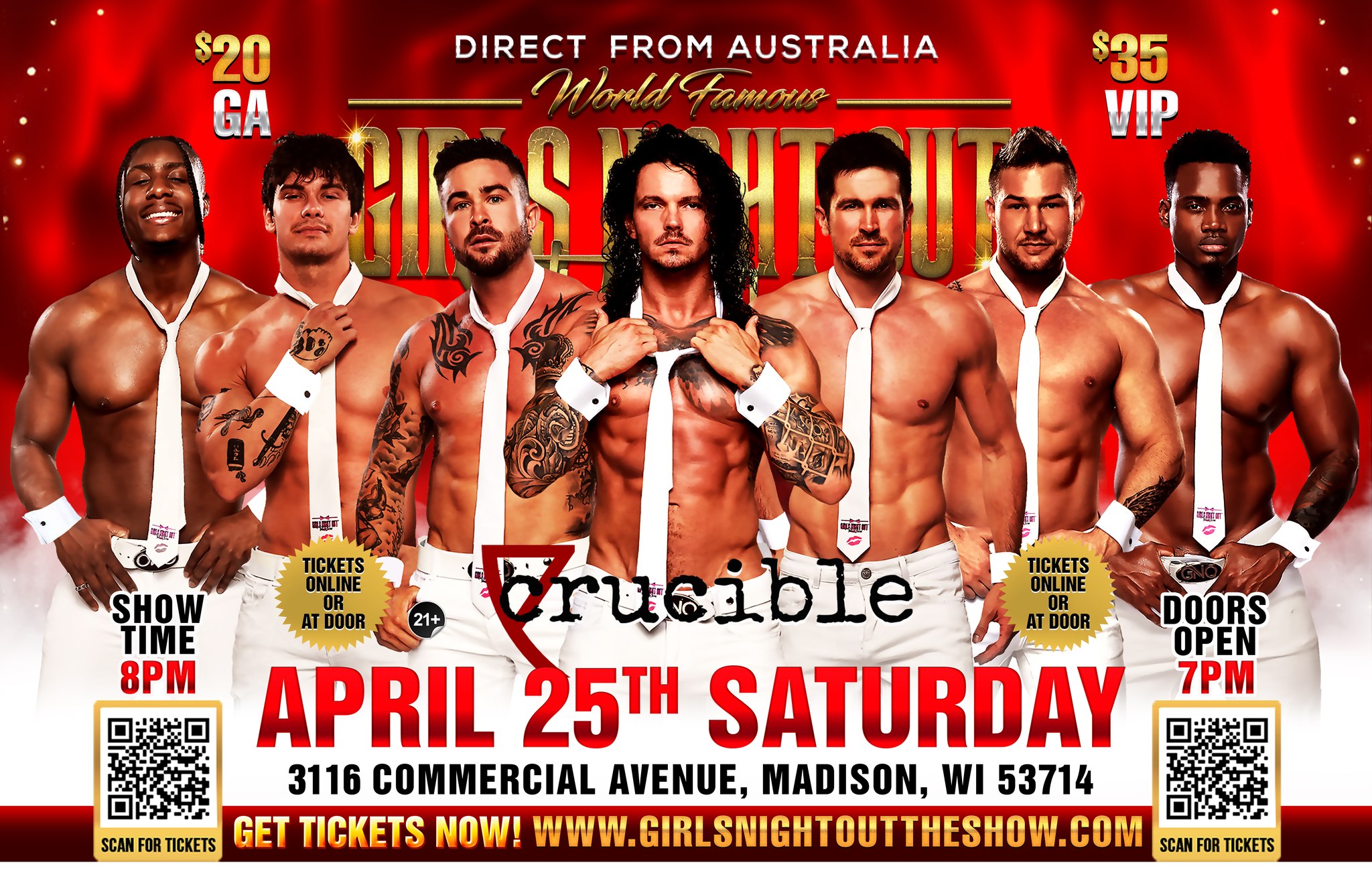 Are you ready for all the abs? Rippling muscle? A bit of sweat? You'd better be. Crucible welcomes Girls Night Out: The Show - 7:00 PM doors, 8:00 PM show, $20, VIP $35. 21+