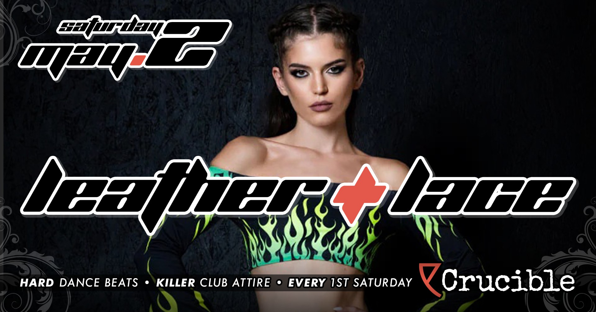 Saturday, May 2nd Lace + Leather returns to Crucible, featuring the best hard dance beats and encouraging killer club attire!